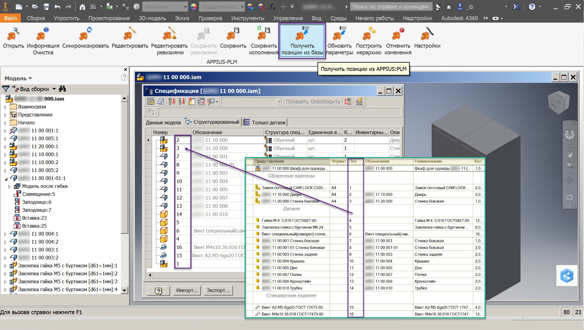 - автоматическое получение позиций из электронной структуры изделия (ЭСИ) Appius-PLM в спецификацию 3D-модели Inventor;