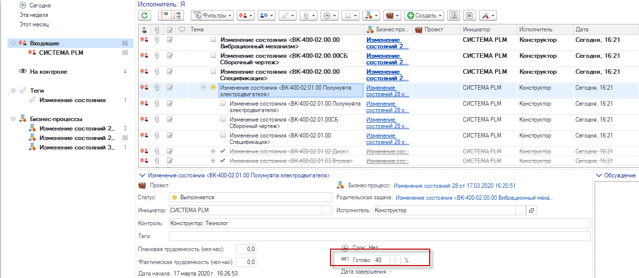 Добавлено событие, которое автоматически запускает (начинает выполнение) вышестоящие задачи, а также подсчитывает общий процент готовности родительских задач (пропорционально трудоемкости).