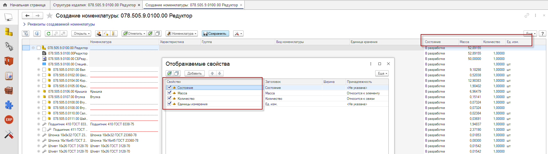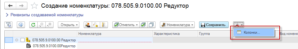 В окне создания номенклатурных позиций добавлена настройка отображаемых свойств (колонок) в дереве.