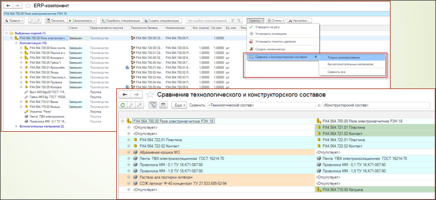 В окне ERP-компонента появилась возможность сравнения технологического и конструкторского составов. Доступно три варианта: только комплектование, без вспомогательных материалов (комплектующие и основные материалы), и полный технологических состав;