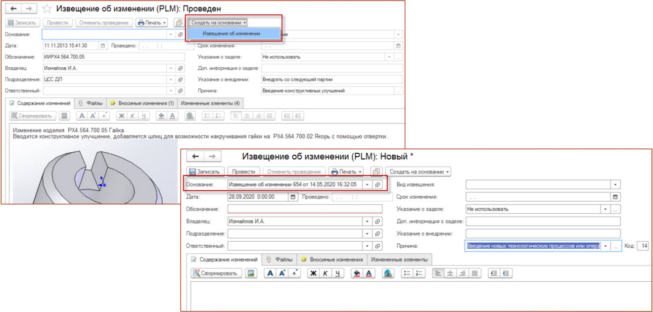 Для документа «Извещение об изменении» включен ввод на основании других ИИ. Это позволяет связать, например, конструкторское ИИ с технологическим, которое создается на основании конструкторских изменений. Также в список ИИ добавлена колонка «Проведен» для быстрого отбора с помощью фильтров.