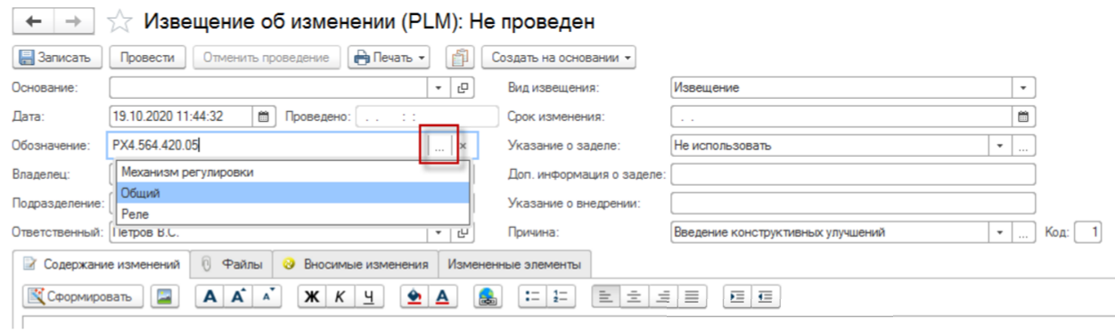 В извещении об изменении добавлена возможность ввода номера (обозначения) документа по маске. Выбранная маска сохраняется в документе для корректного отображения присвоенного номера форме.